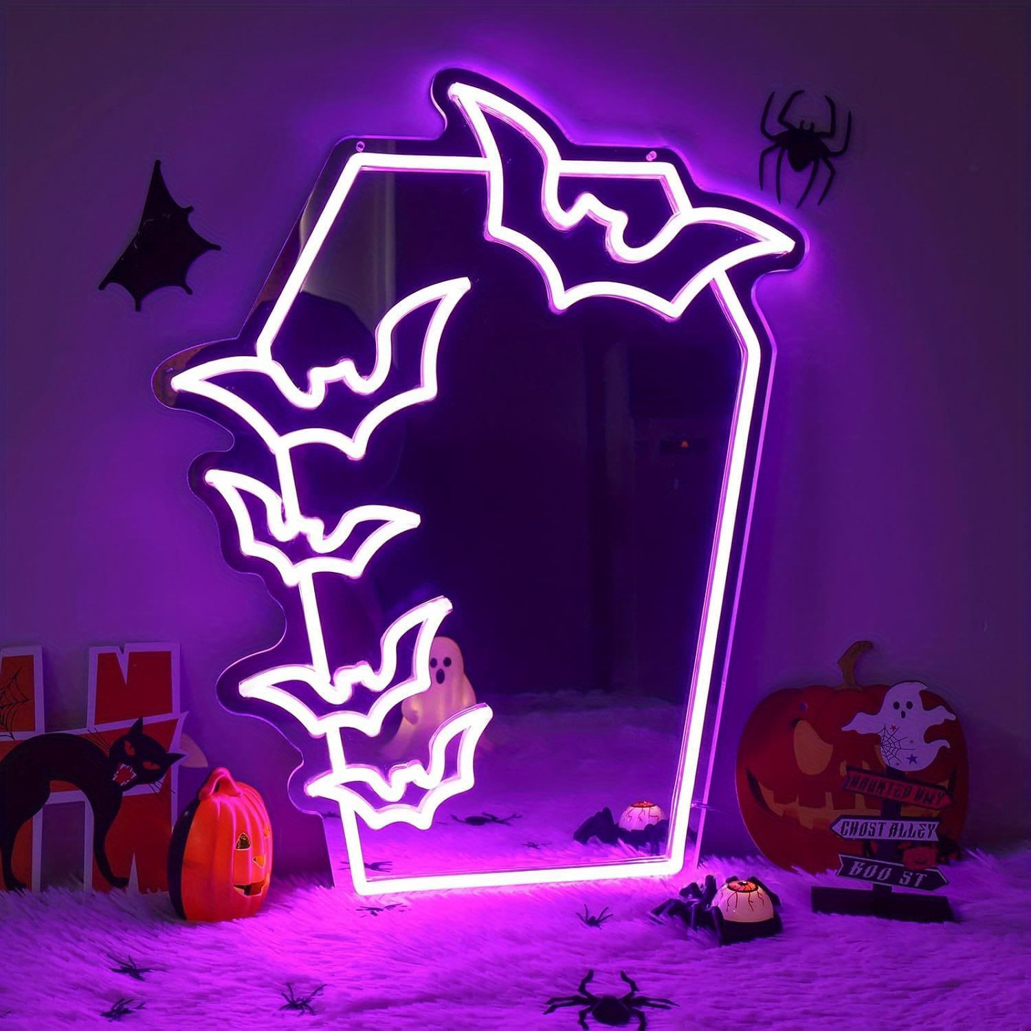 1pc Gothic Coffin Bat Neon Mirror Sign, LED Wall Mounted Makeup Mirror with Multicolor Glow, USB Powered, Switch Control, Plastic Material, Ideal for Bedroom, Makeup Room, Gift - Purple, White, Red